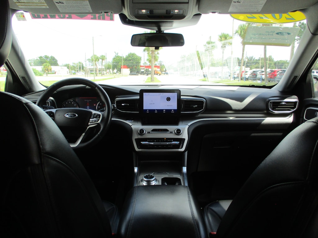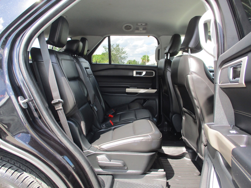 This 2022 Ford Explorer XLT in Agate Black Metallic features: 1st Row Heated Seats, 2nd Row 35/30/35 Bench w/E-Z Entry & Armrest, 3.58 Non-Limited-Slip Rear Axle Ratio, 3rd row seats: bench, 4-Wheel Disc Brakes, 6 Speakers, ABS brakes, ActiveX Captain's Chairs, Air Conditioning, Alloy wheels, AM/FM radio: SiriusXM, AM/FM Stereo, Auto High-beam Headlights, Auto Start-Stop Removal, Automatic temperature control, Brake assist, Bumpers: body-color, Cargo Area Management System, Compass, Delay-off headlights, Driver door bin, Driver vanity mirror, Dual front impact airbags, Dual front side impact airbags, Electronic Stability Control, Emergency communication system: SYNC 3 911 Assist, Equipment Group 202A, Exterior Parking Camera Rear, FordPass Connect, Four wheel independent suspension, Front & Second Row Floor Liners (16B), Front anti-roll bar, Front Bucket Seats, Front Center Armrest, Front dual zone A/C, Front reading lights, Fully automatic headlights, Heated door mirrors, Heated front seats, Heated Steering Wheel, Illuminated entry, Knee airbag, Leather steering wheel, LED Fog Lamps, Low tire pressure warning, Occupant sensing airbag, Outside temperature display, Overhead airbag, Overhead console, Panic alarm, Passenger door bin, Passenger vanity mirror, Power door mirrors, Power driver seat, Power Liftgate, Power passenger seat, Power steering, Power windows, Rear air conditioning, Rear anti-roll bar, Rear Auxiliary Controls Credit, Rear reading lights, Rear window defroster, Rear window wiper, Remote keyless entry, Remote Start System, Roof rack: rails only, SecuriCode Keyless Entry Keypad, Security system, Speed control, Speed-sensing steering, Speed-Sensitive Wipers, Split folding rear seat, Spoiler, Steering wheel mounted audio controls, SYNC 3 Communications & Entertainment System, SYNC 3/Apple CarPlay/Android Auto, Tachometer, Telescoping steering wheel, Tilt steering wheel, Traction control, Trip computer, Unique Cloth Captain's Chairs, Variably intermittent wipers, Wheels: 18" 5-Spoke Silver-Painted Aluminum.